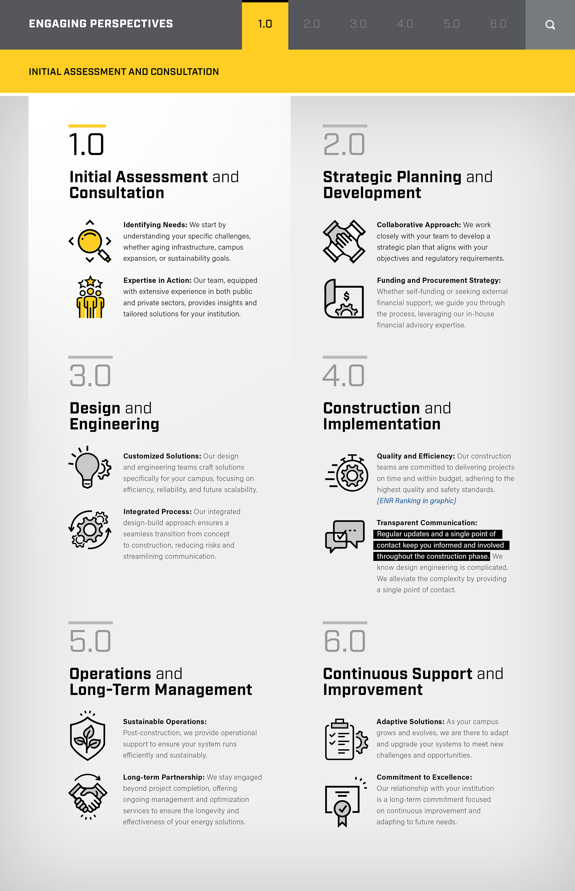 As a contract designer for Engaging Perspectives, I created an infographic for Kiewit to showcase their campus energy solutions process. Working from newly released brand guidelines, I designed a clean, easy-to-follow layout that walked audiences through six key phases, from initial consultation to long-term support.