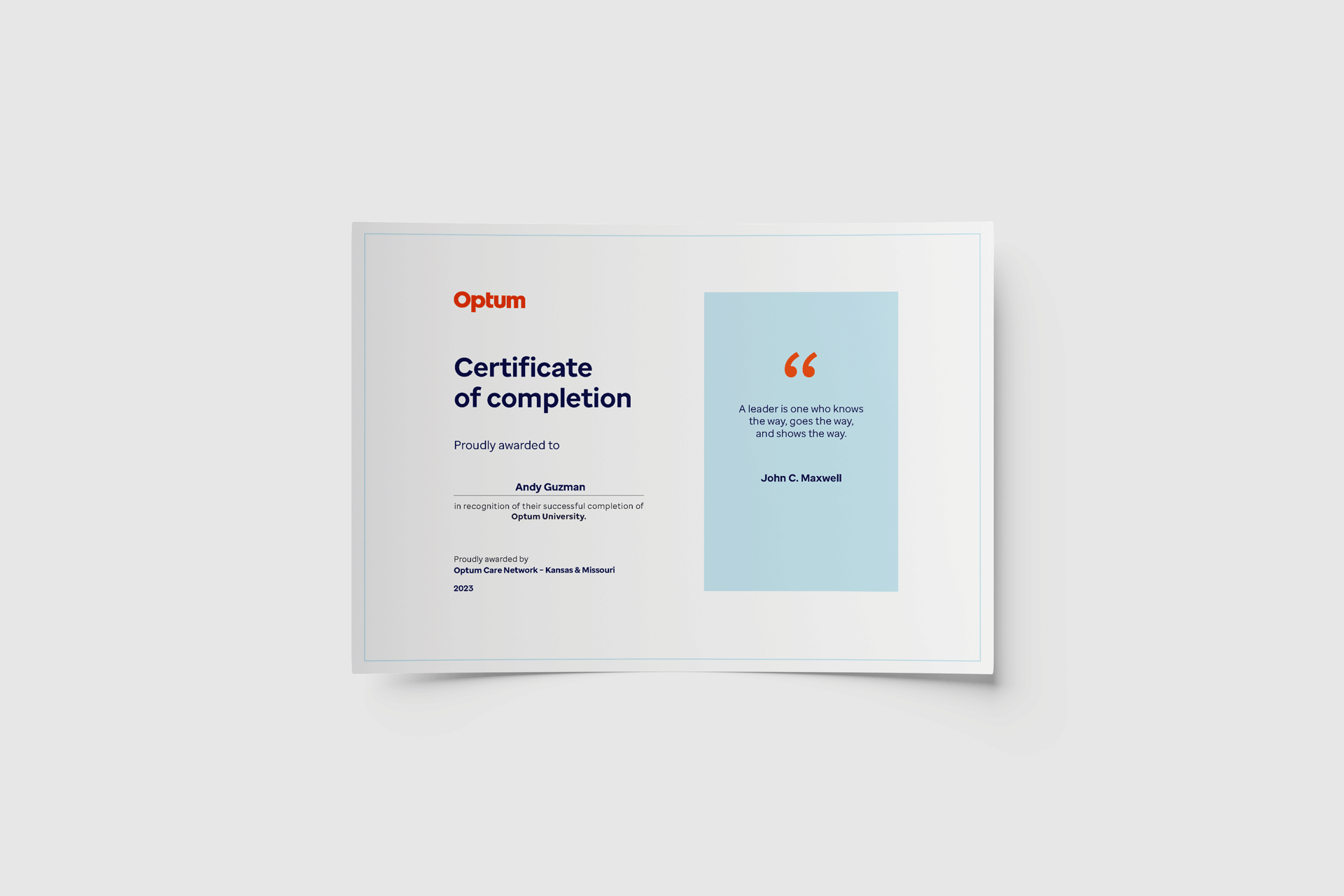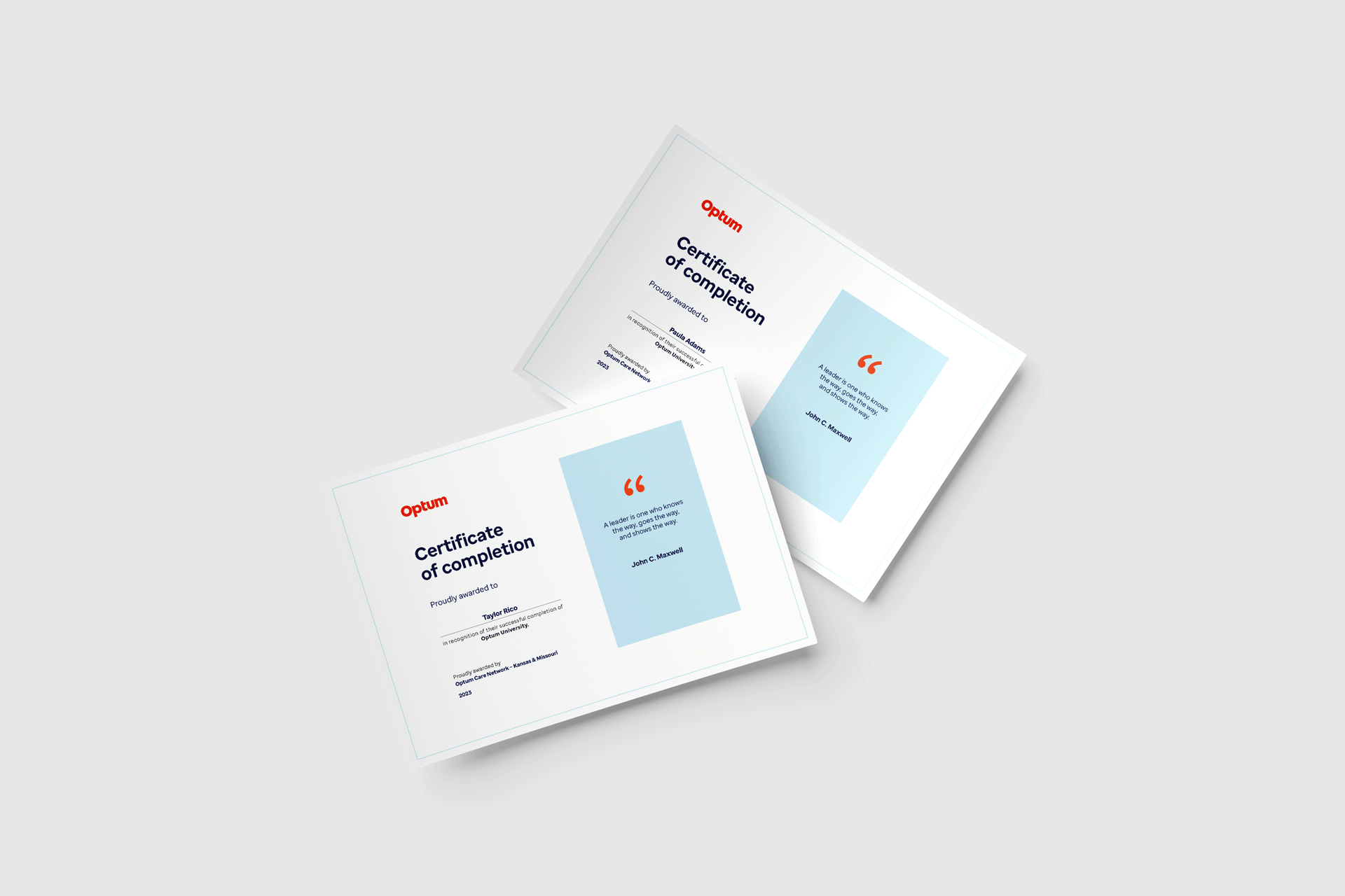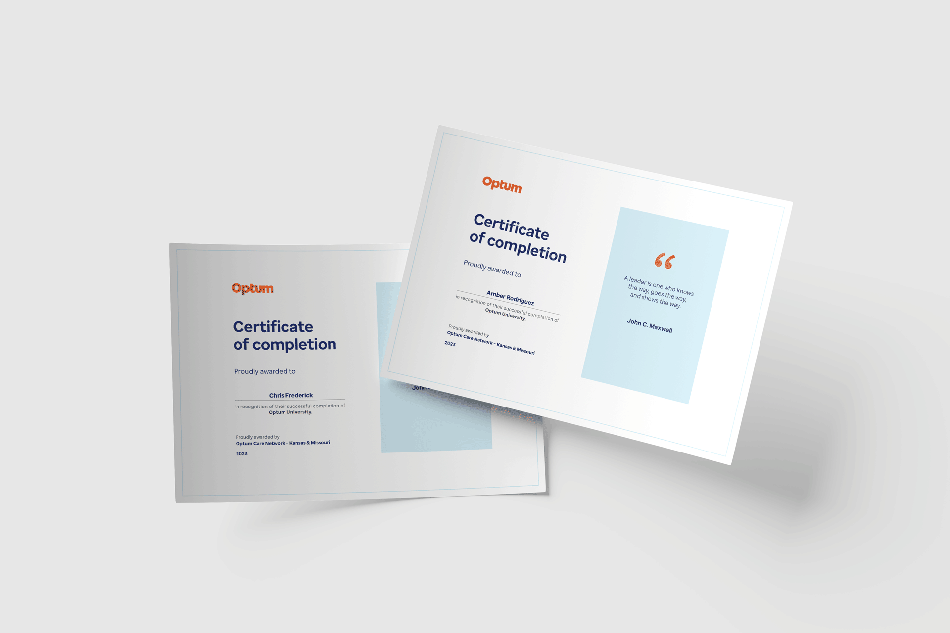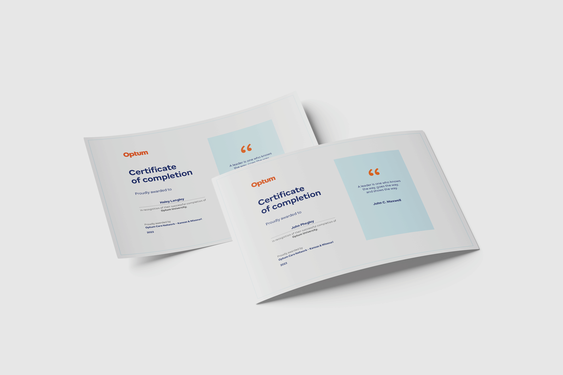 I was asked to design an official, diploma-style certificate inspired by traditional university aesthetics using Optum brand standards. To streamline production, I offered data-merge services using the graduate list provided in Excel, allowing for fast, accurate personalization of each certificate. The final deliverables included a polished master certificate design, merged individualized PDFs for each graduate, and print-ready files. I also coordinated print options through a trusted local production partner for quick turnaround. A fast-paced project with a clean, formal result—delivered on time for graduation day.