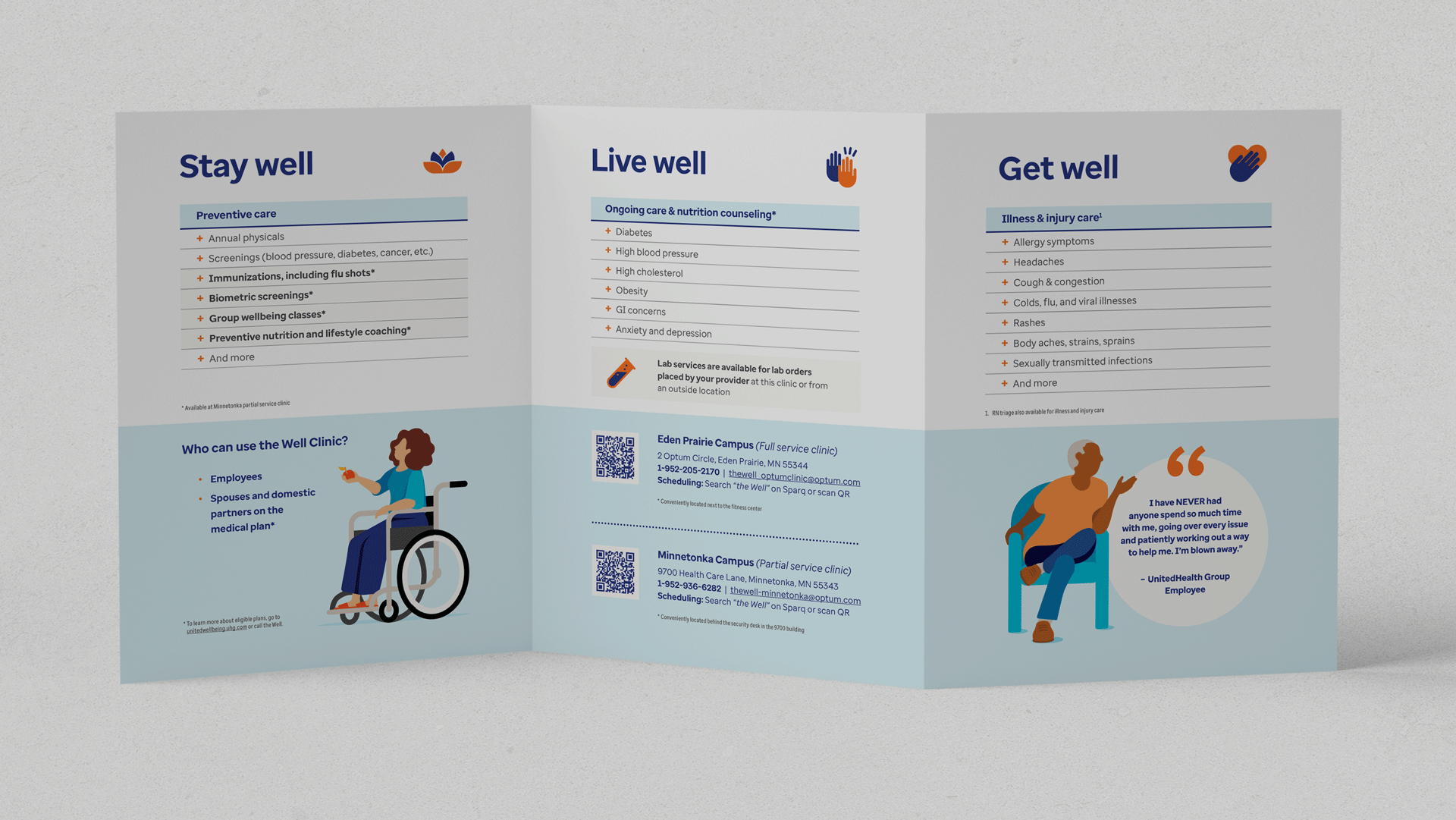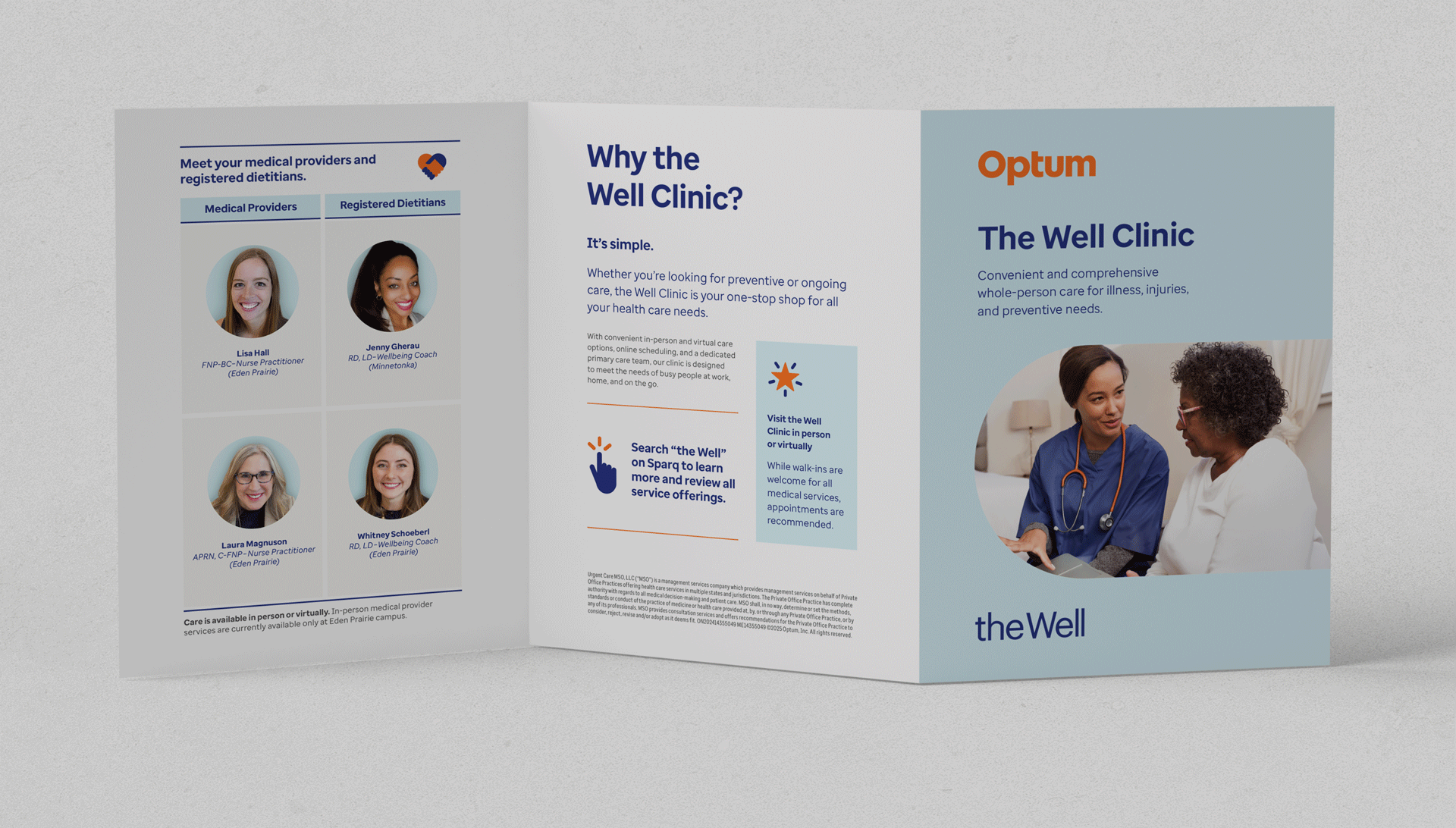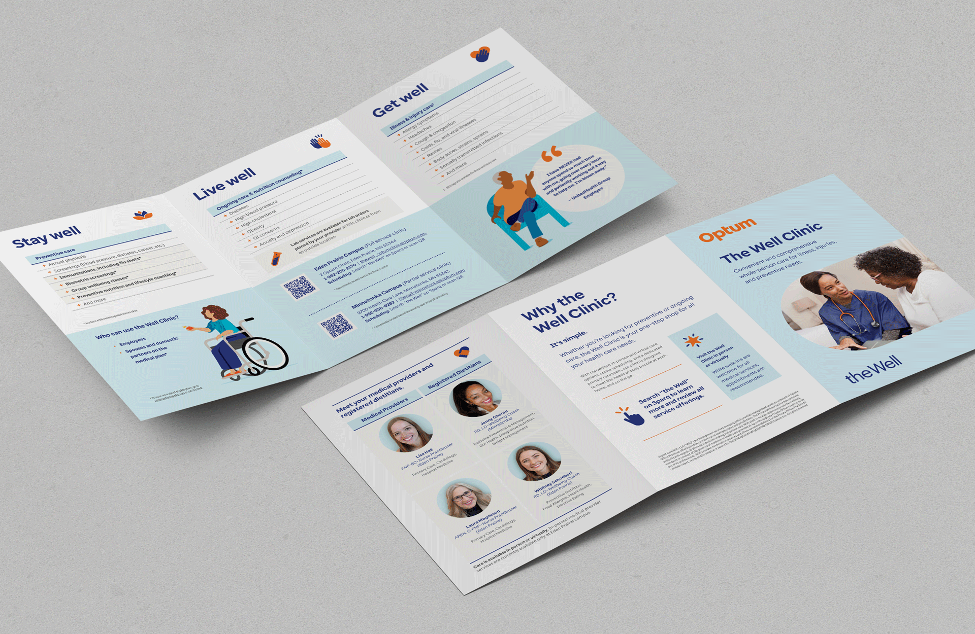A refreshed trifold brochure for The Well Clinic at Optum — redesigned for clarity, flow, and brand alignment. This C-fold layout organizes complex healthcare information into a clear, approachable format, balancing Optum’s corporate professionalism with an inviting, human touch. Approved by compliance.