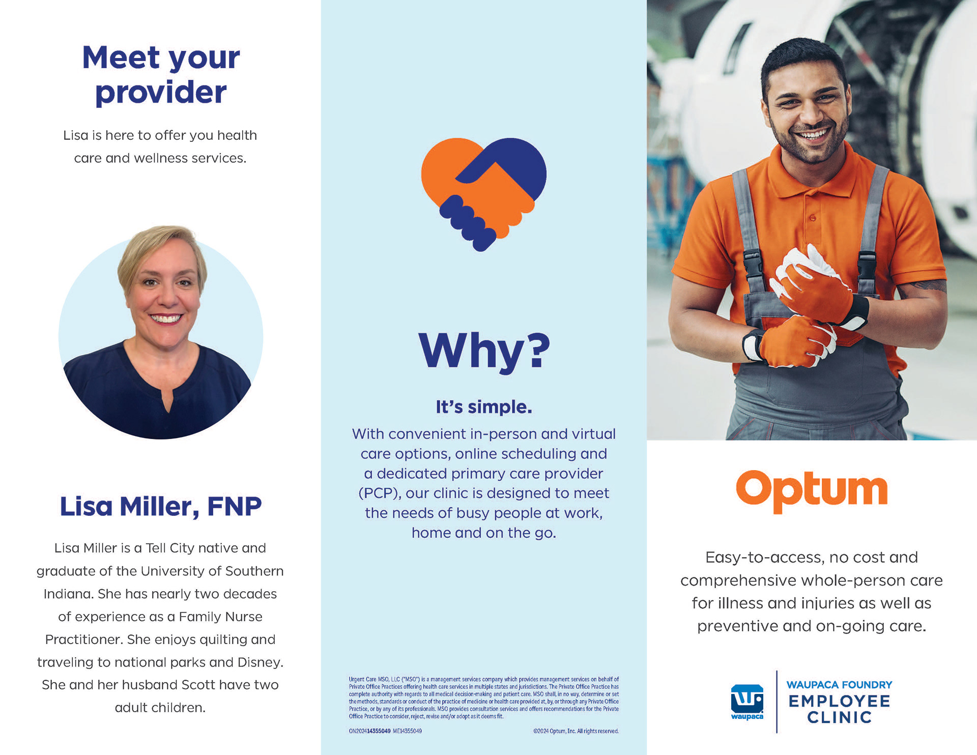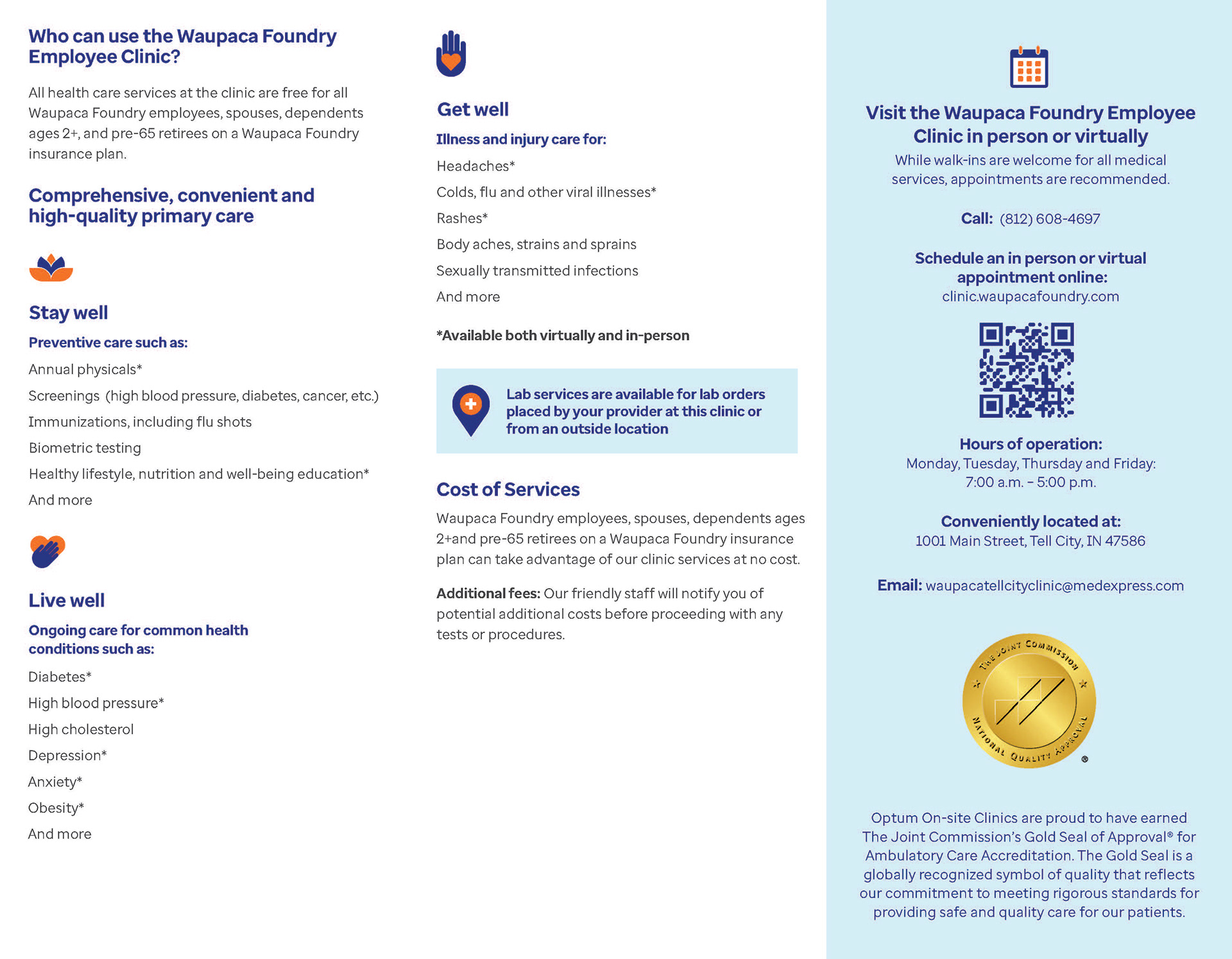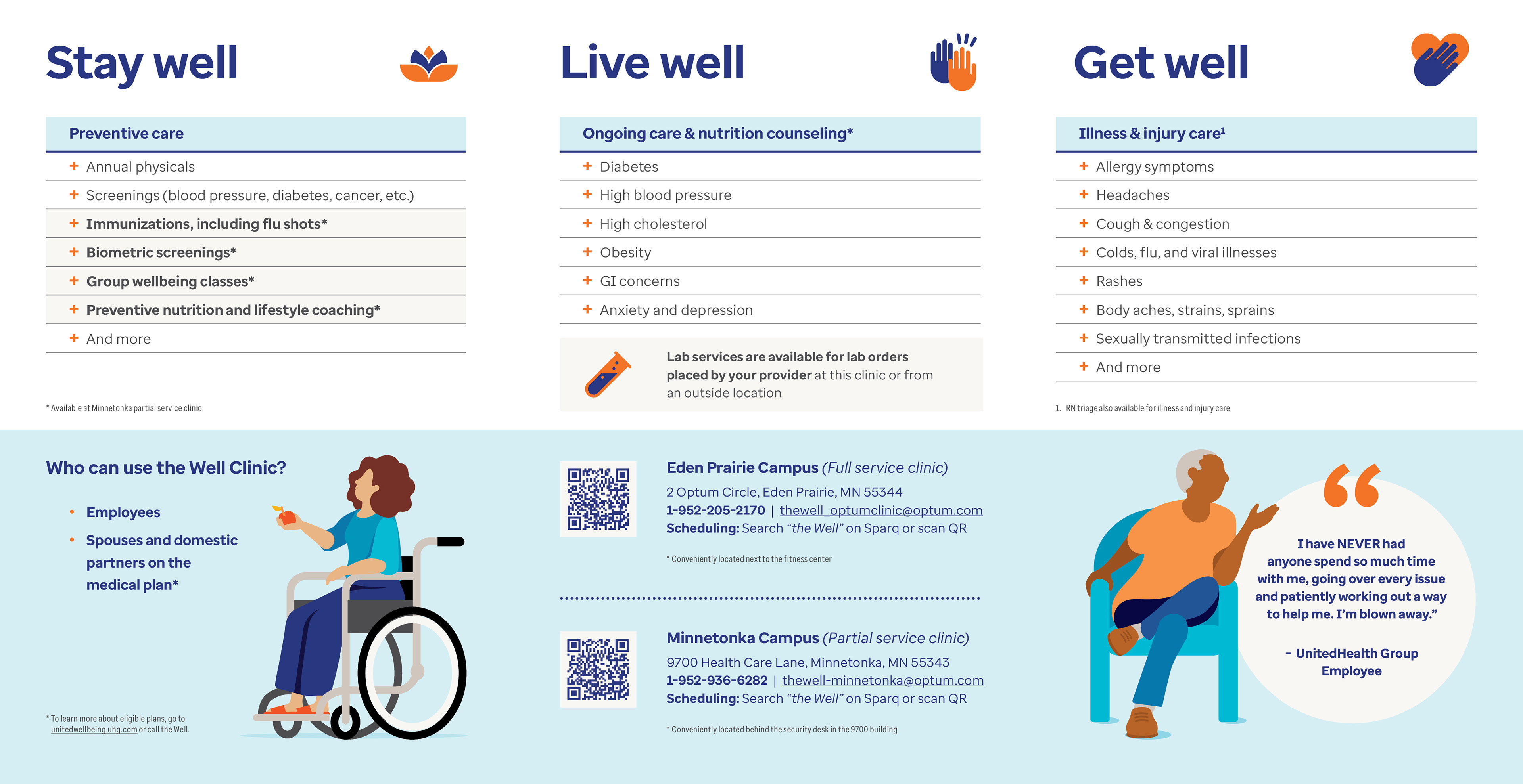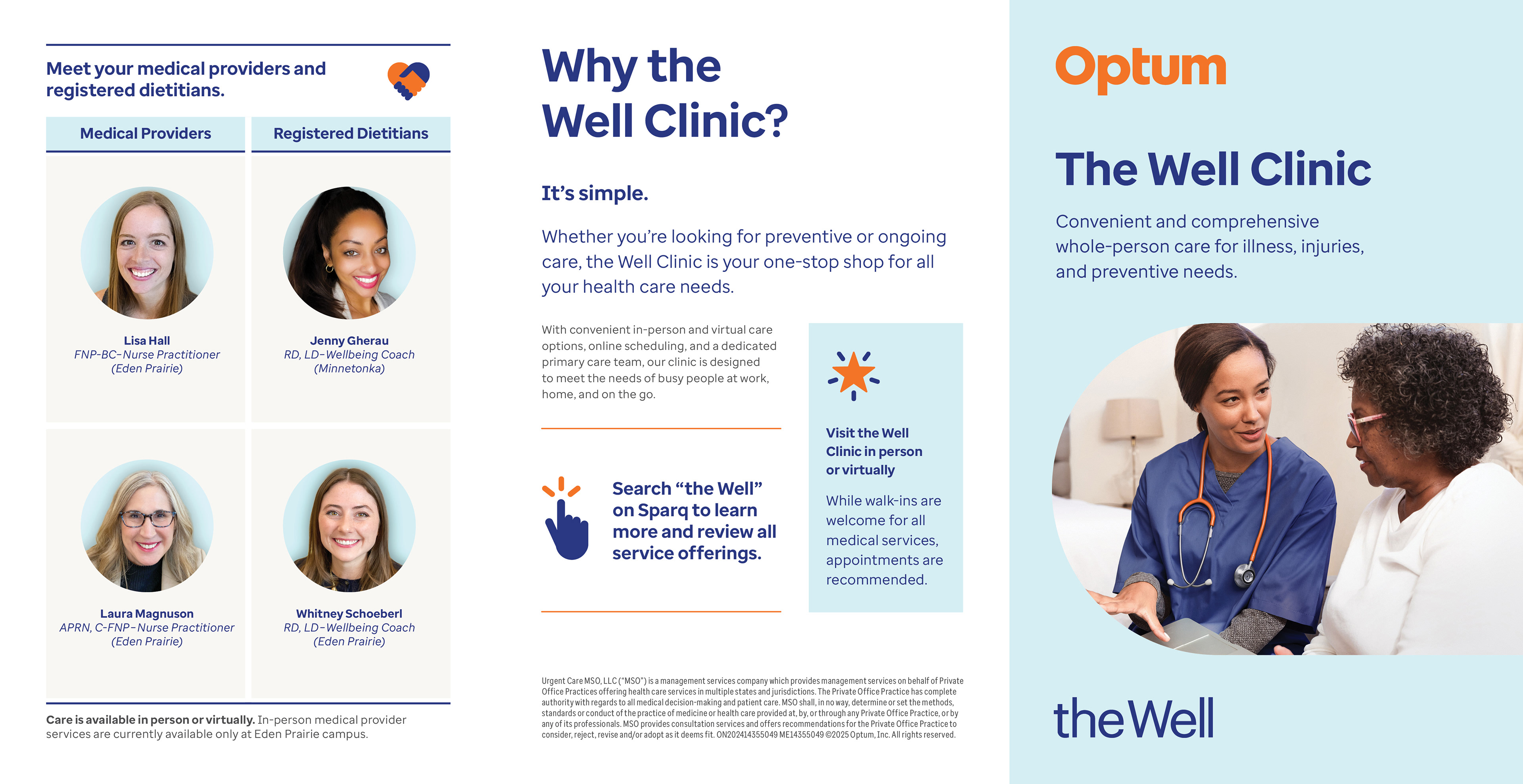 A refreshed trifold brochure for The Well Clinic at Optum — redesigned for clarity, flow, and brand alignment. This C-fold layout organizes complex healthcare information into a clear, approachable format, balancing Optum’s corporate professionalism with an inviting, human touch. Approved by compliance.